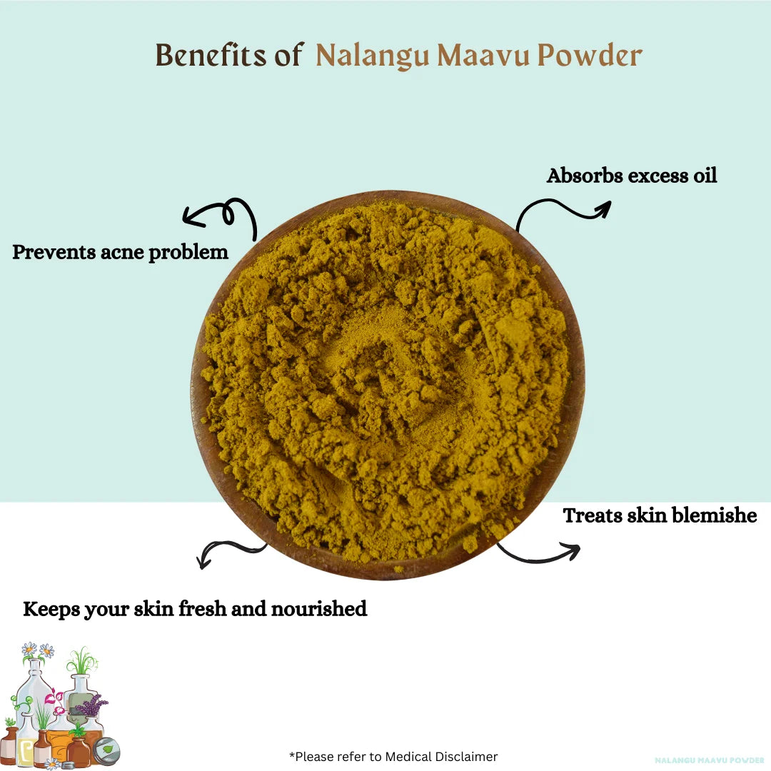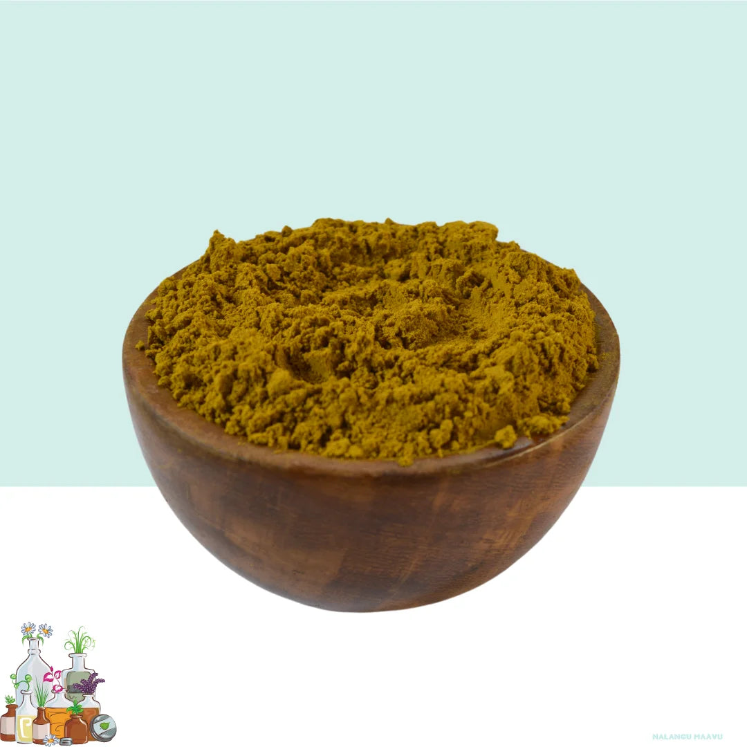 Turmeric Bath Powder, also known as Nalangu Maavu, is a traditional Ayurvedic herbal cleanser enriched with turmeric and skin-purifying herbs. Used for generations in Indian skincare rituals, this herbal blend helps brighten the skin, absorb excess oil, and promote a healthy, even complexion. Free from harsh chemicals and artificial additives, it gently exfoliates, leaving the skin soft, smooth, and refreshed. At Maduras Herbals, we ensure our Nalangu Maavu Turmeric Bath Powder is finely processed to retain its natural goodness and skin-enhancing properties.